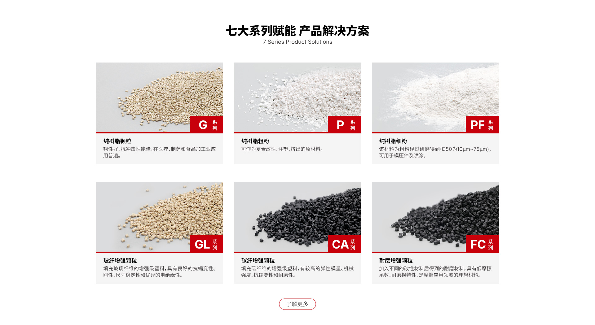 純樹脂顆粒G系列 純樹脂細(xì)粉PF系列 純樹脂粗粉P系列 玻纖增強(qiáng)GL系列 碳纖增強(qiáng)CA系列 耐磨FC系列 應(yīng)用定制系列